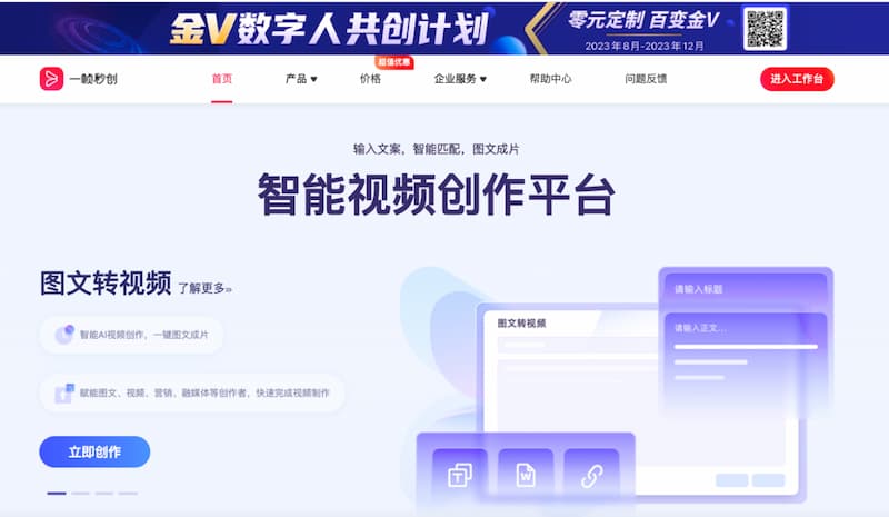 一帧秒创是基于秒创AIGC引擎的智能AI内容生成平台,为创作者和机构提供AI生成服务,包括文字续写、文字转语音、文生图、图文转视频等创作服务,一帧秒创通过对文案、素材、AI语音、字幕等进行智能分析,快速成片,零门槛创作视频