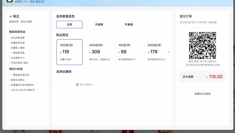 付费使用,注册登录赠送4豆,生成一次1-2豆,具体充值费用如下: